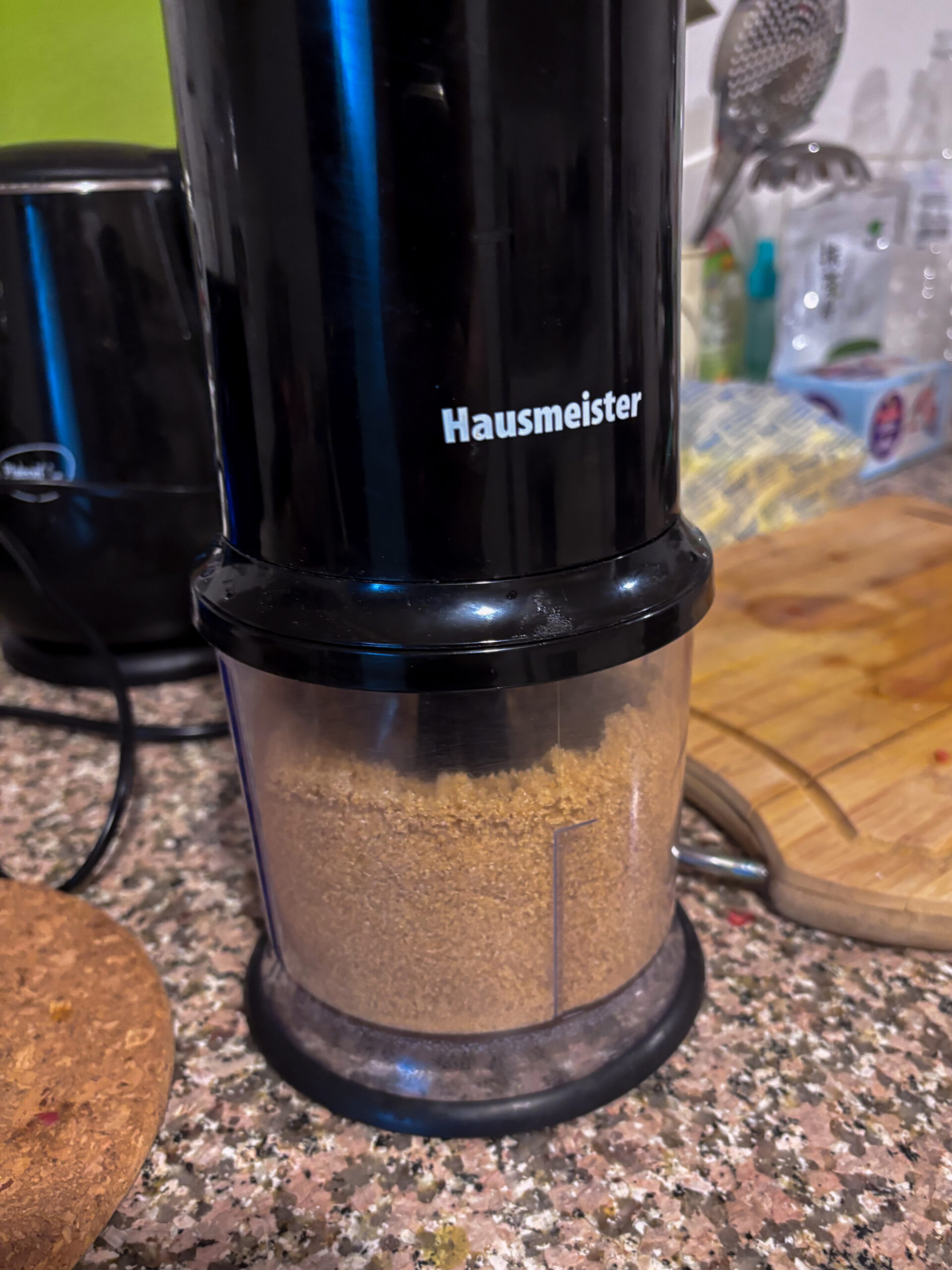 - Následne je potrebné si podrtiť trstinový cukor na jemnejšie (300 g). Ja som to robila v takom mini mixéry (1).