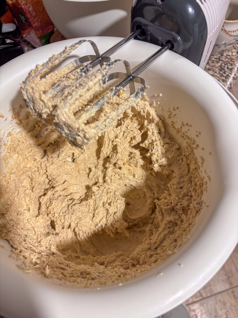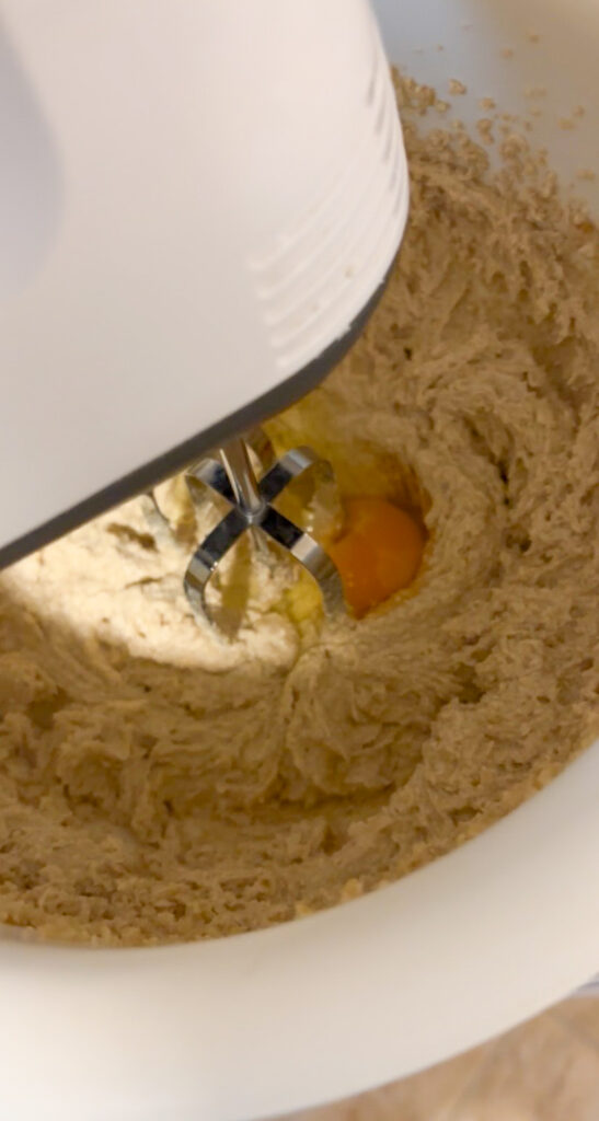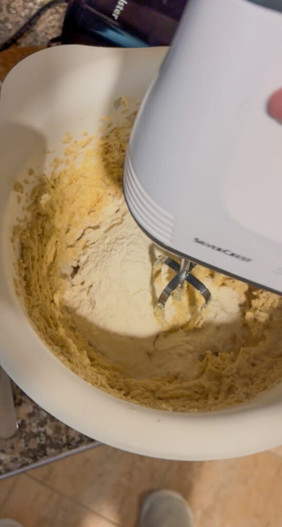- Keď sú vajíčka inkorporované do cesta, postupne prisypte múčnu zmes – znova mixérom (5).