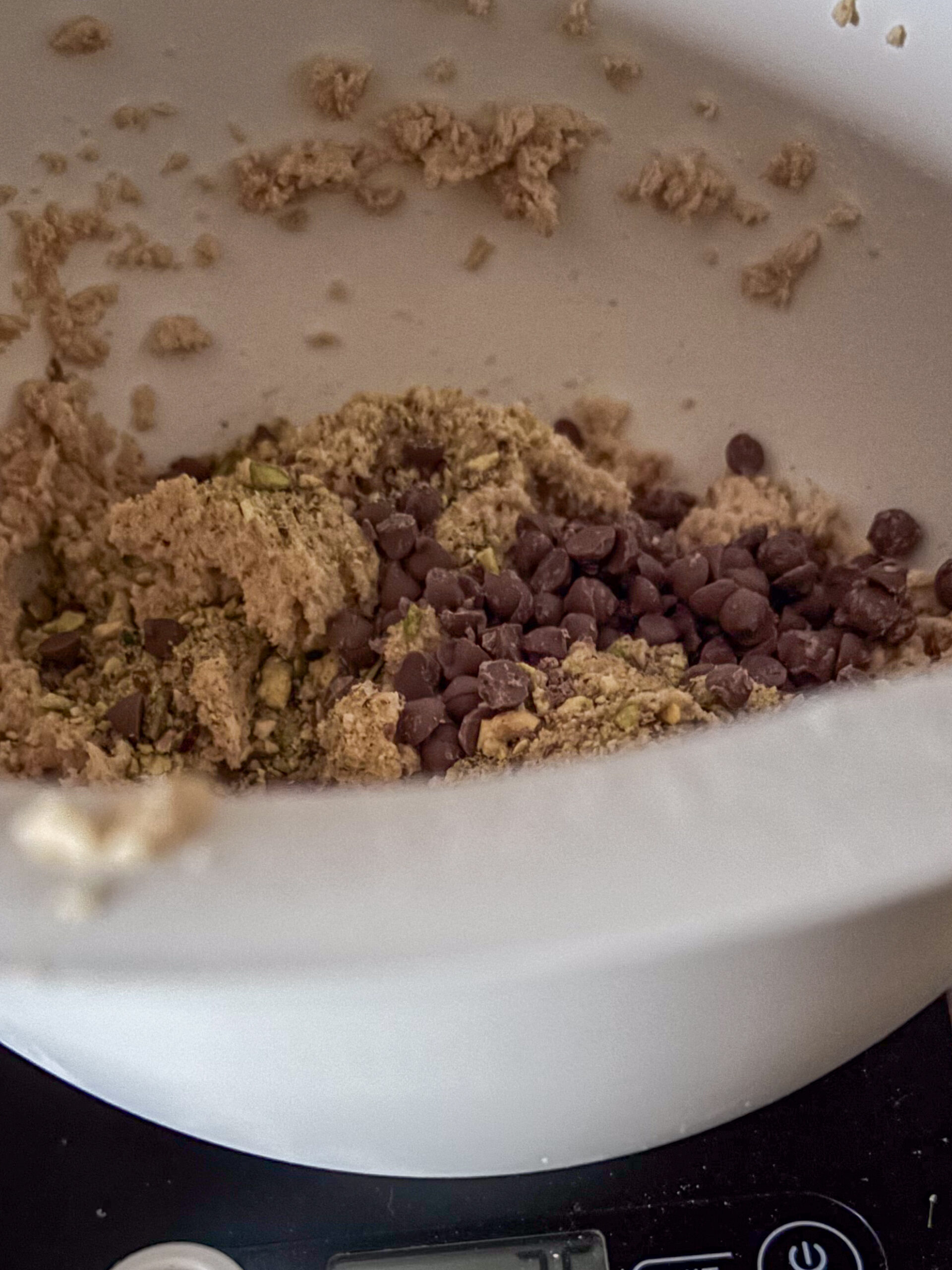 - Keď je cesto hotové (6), bez mixéra primiešajte čoko kúsky a rozdrvené pistácie (trochu pistácií si nechajte na posypanie cookies pred pečením) (7, 8)