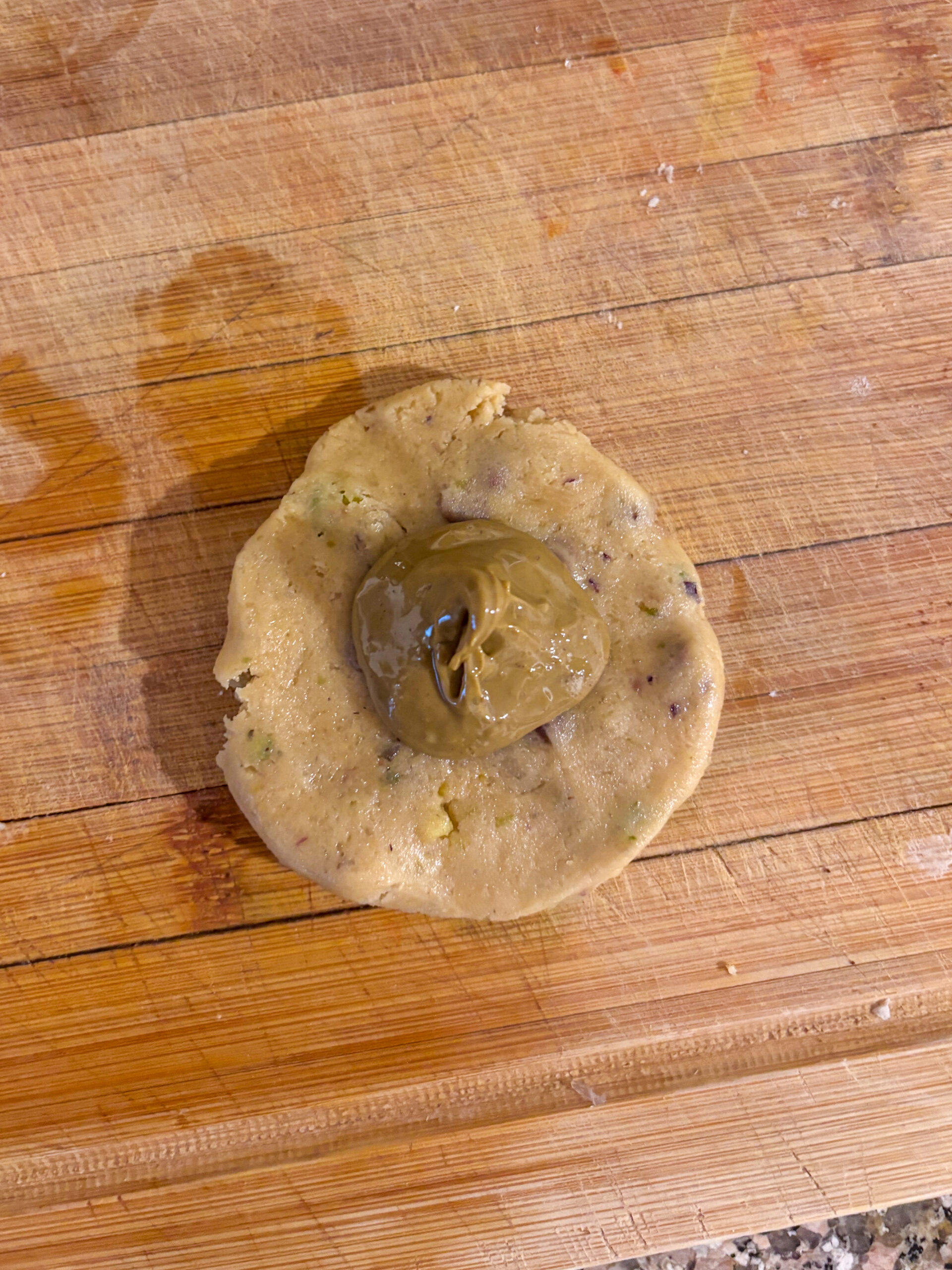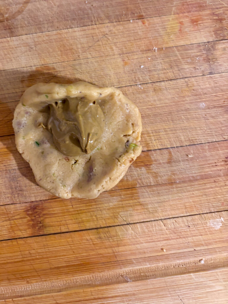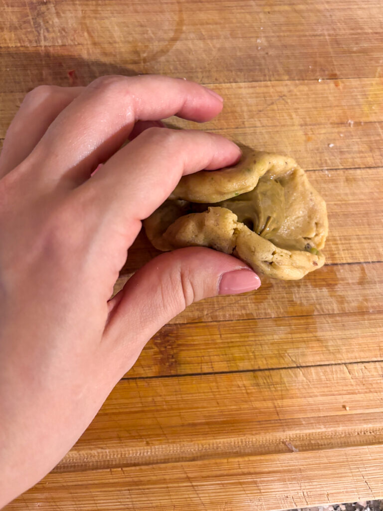 - Do stredu placky pridajte cca. polovicu alebo celú kávovú lyžičku pistáciového krému (9) a guličku opatrne zabaľte späť na hladkú guličku (10, 11). Moc netlačte, aby vám nezačal krém vytekať z bokov/štrbín (ak sa náhodou aj stane, môžete kúsok cesta z misky vziať a zalepiť to opatrne)