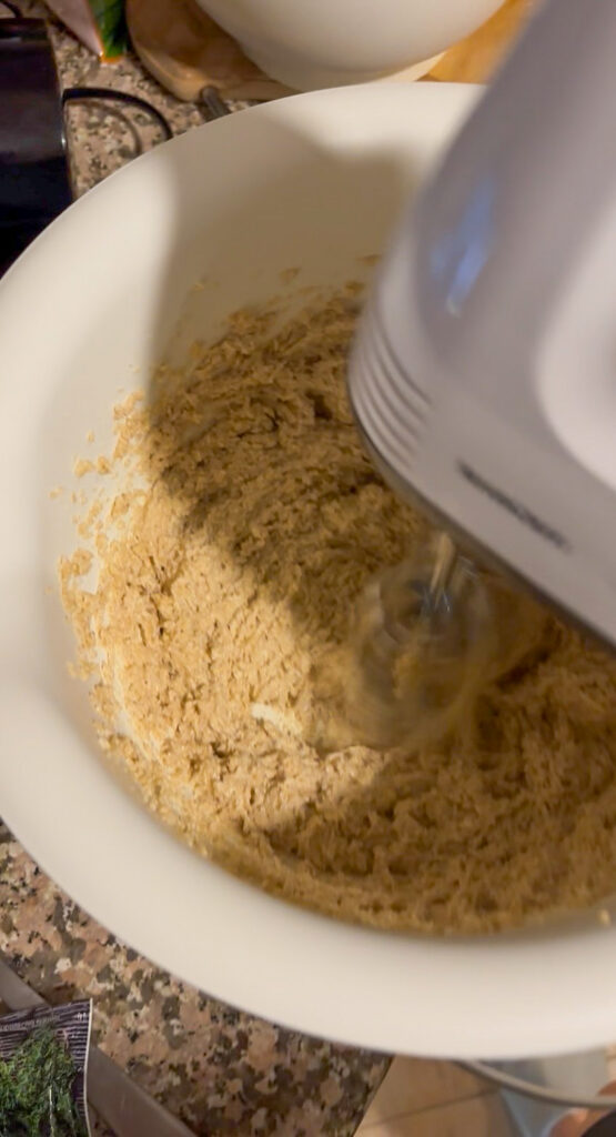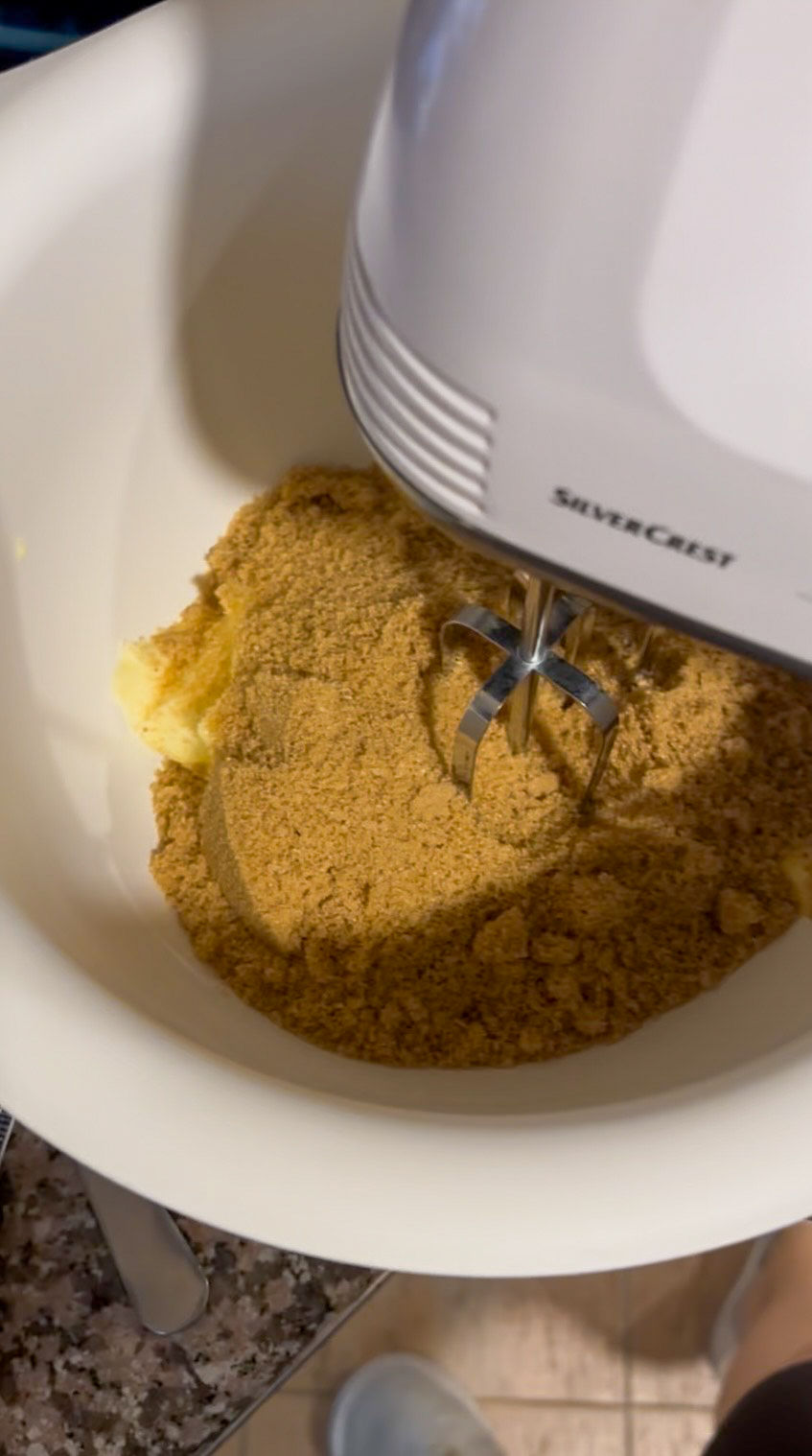- V druhej väčšej miske rozmixujte zmäknuté maslo (225 g) (2) s cukrom na svetlú penu (ručným mixérom) (3).