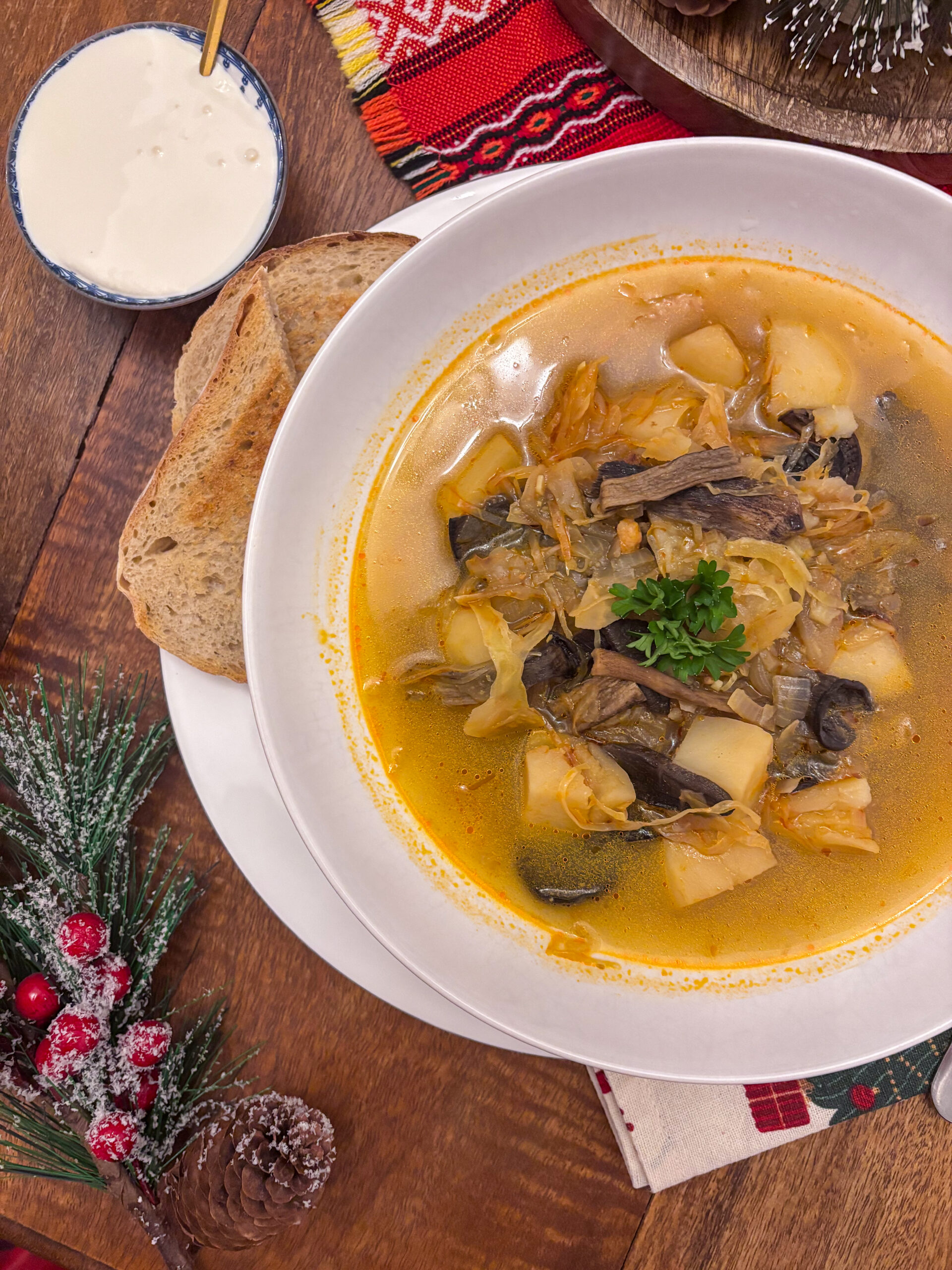 Čo je najviac, kapustnica je vlastne veľmi jednoduché jedlo. Stačí vám kapusta, sušené hríby, cibuľa, čo to korenia a voda. Pridať samozrejme môžete slivky, zemiaky alebo klobásu. Niekto kapustnicu zahusťuje, mne to osobne pri tomto štýle polievky nechýba, takže ja nezahusťujem. A samozrejme, na konci pridať kyslú smotanu, kto chce. Tak poďme na to.